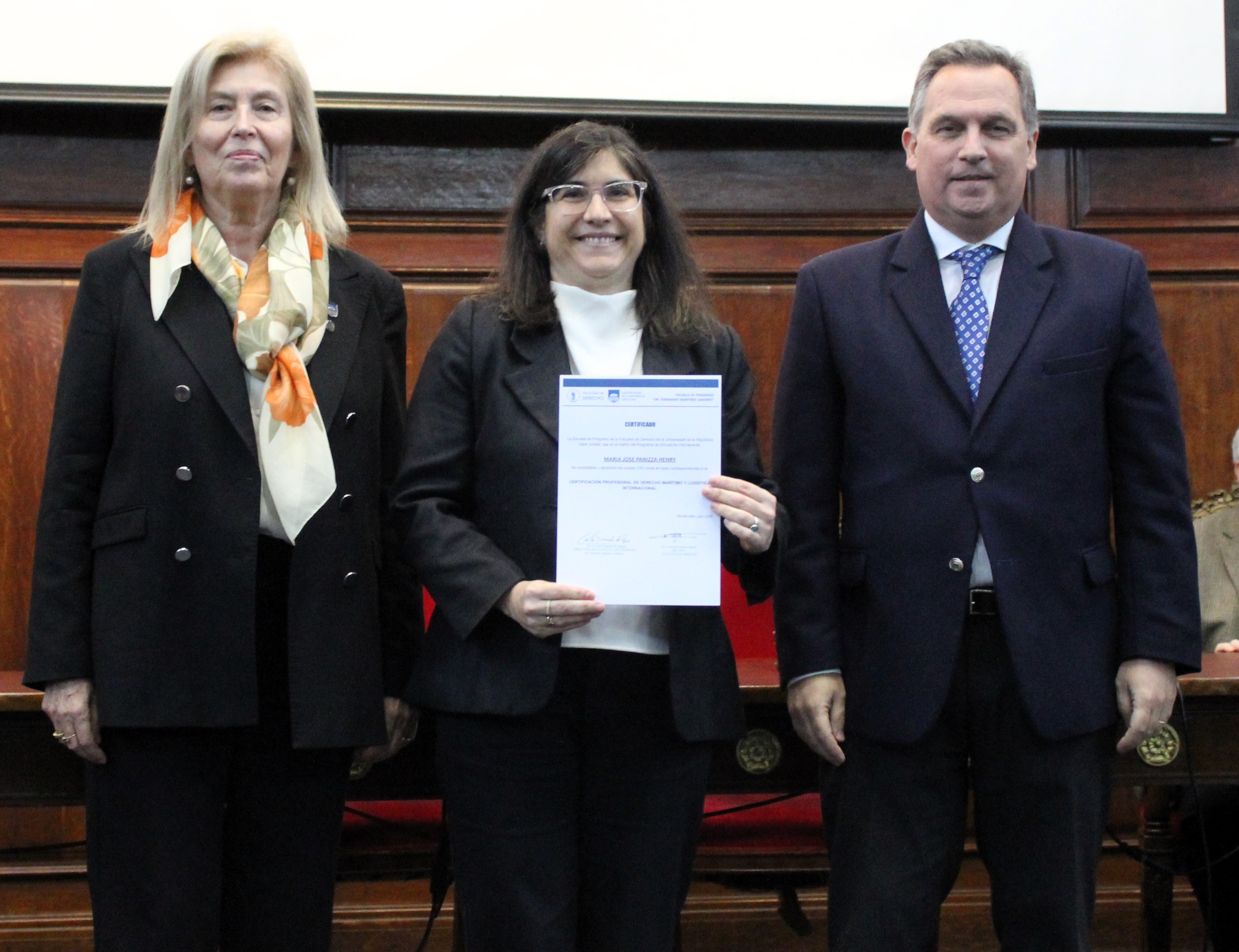 La entrega de diplomas estuvo a cargo de la directora de la Escuela de Posgrado, Cecilia Fresnedo, y del decano de la Facultad, Gonzalo Lorenzo, acompañados por el director de la Certificación, Alejandro Miller, la responsable del Área de Derecho Marítimo, María Victoria Zorrilla, el responsable del Área de Logística y presidente del INALOG, Jerónimo Reyes, y el vicepresidente de la ANP, Tany Mendiondo.