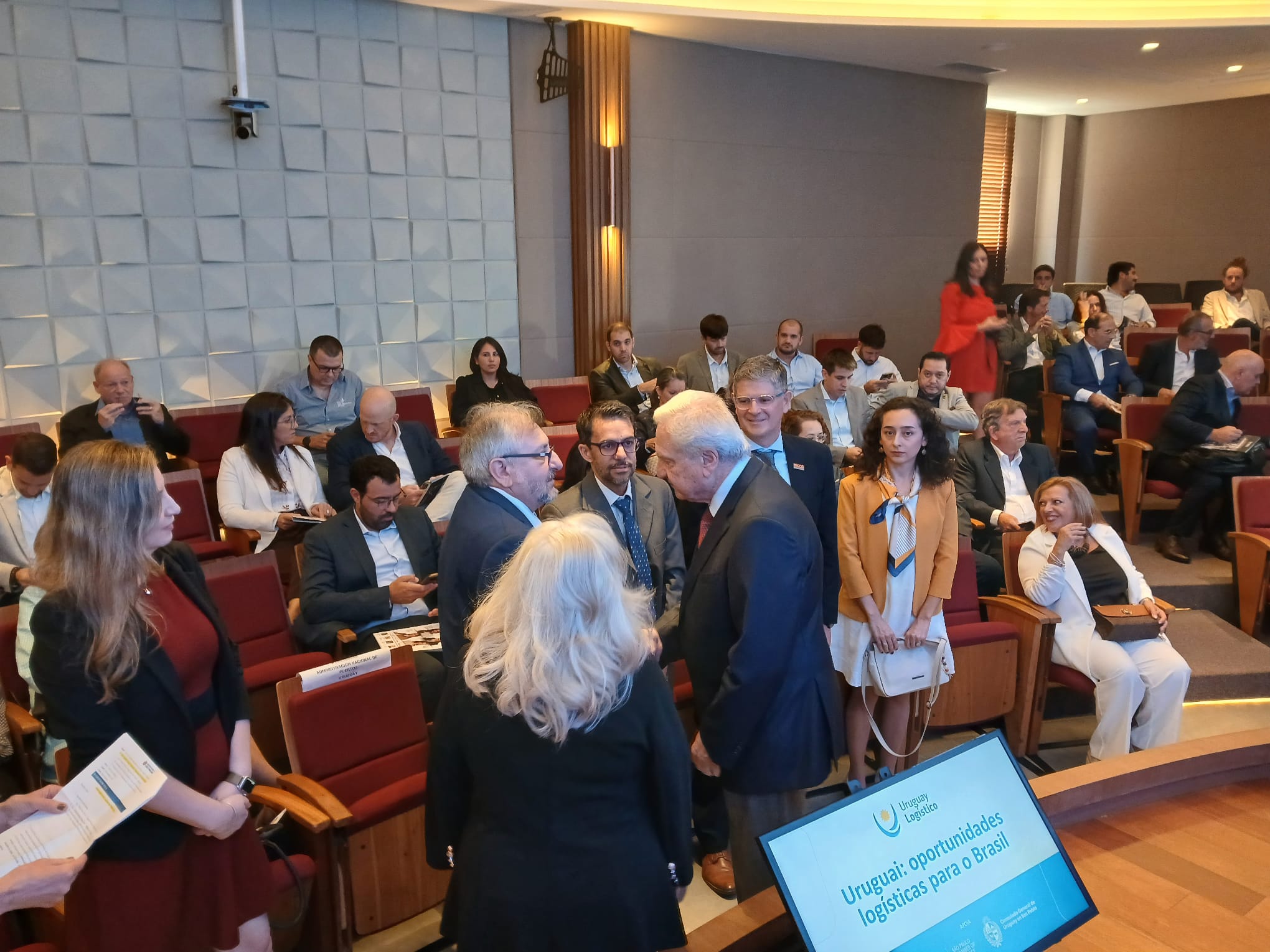 Auditorio en forma semicircular con personas sentadas y una gran pantalla en el escenario con el texto "Uruguai: oportunidades logísticas para o Brasil"