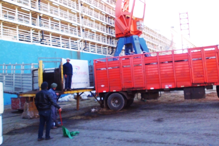 Operando en los puestos 8 y 9, carga 6000 toneladas de productos agricolas este buque ganadero agenciado por VelmarenSA.