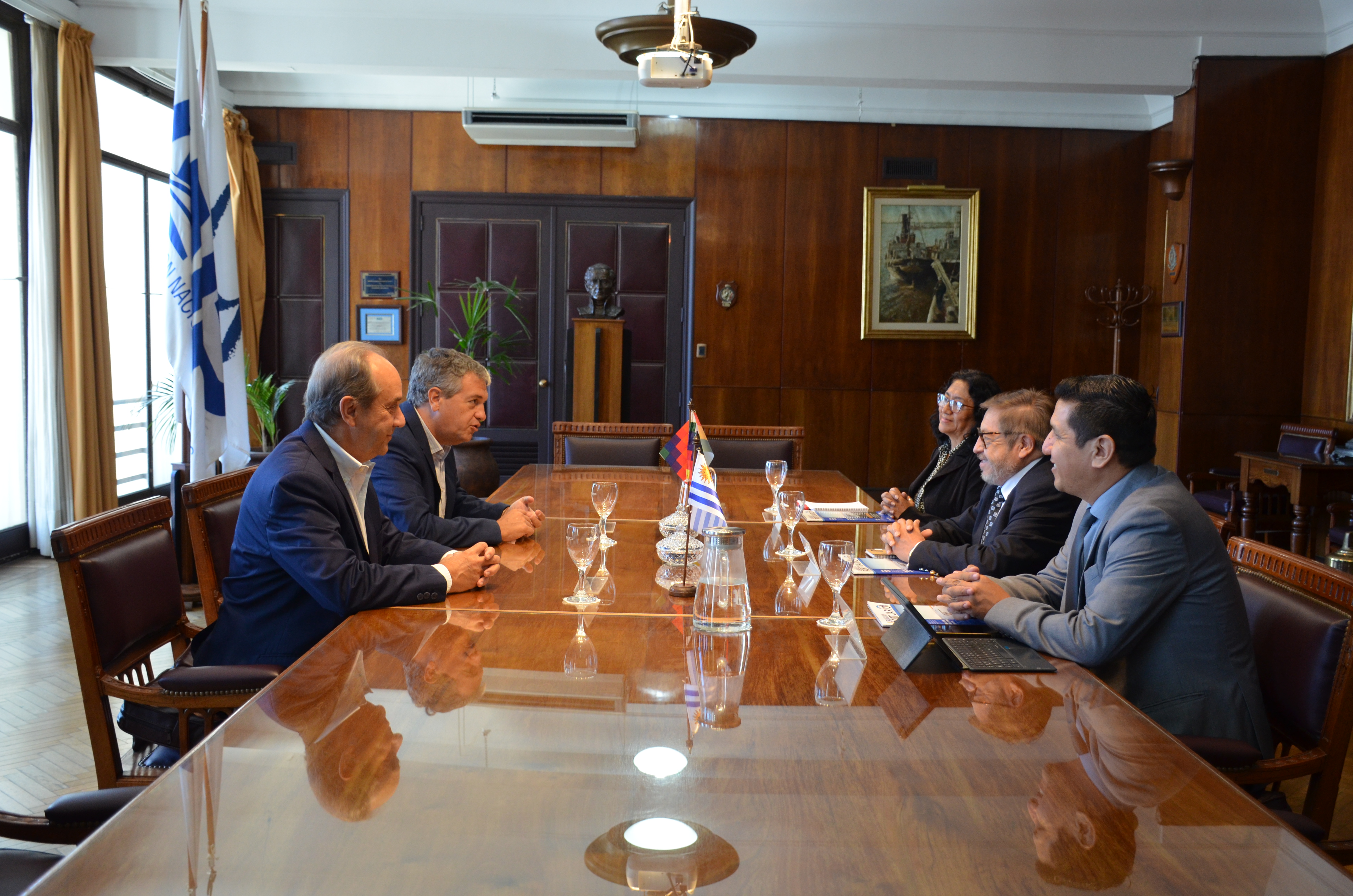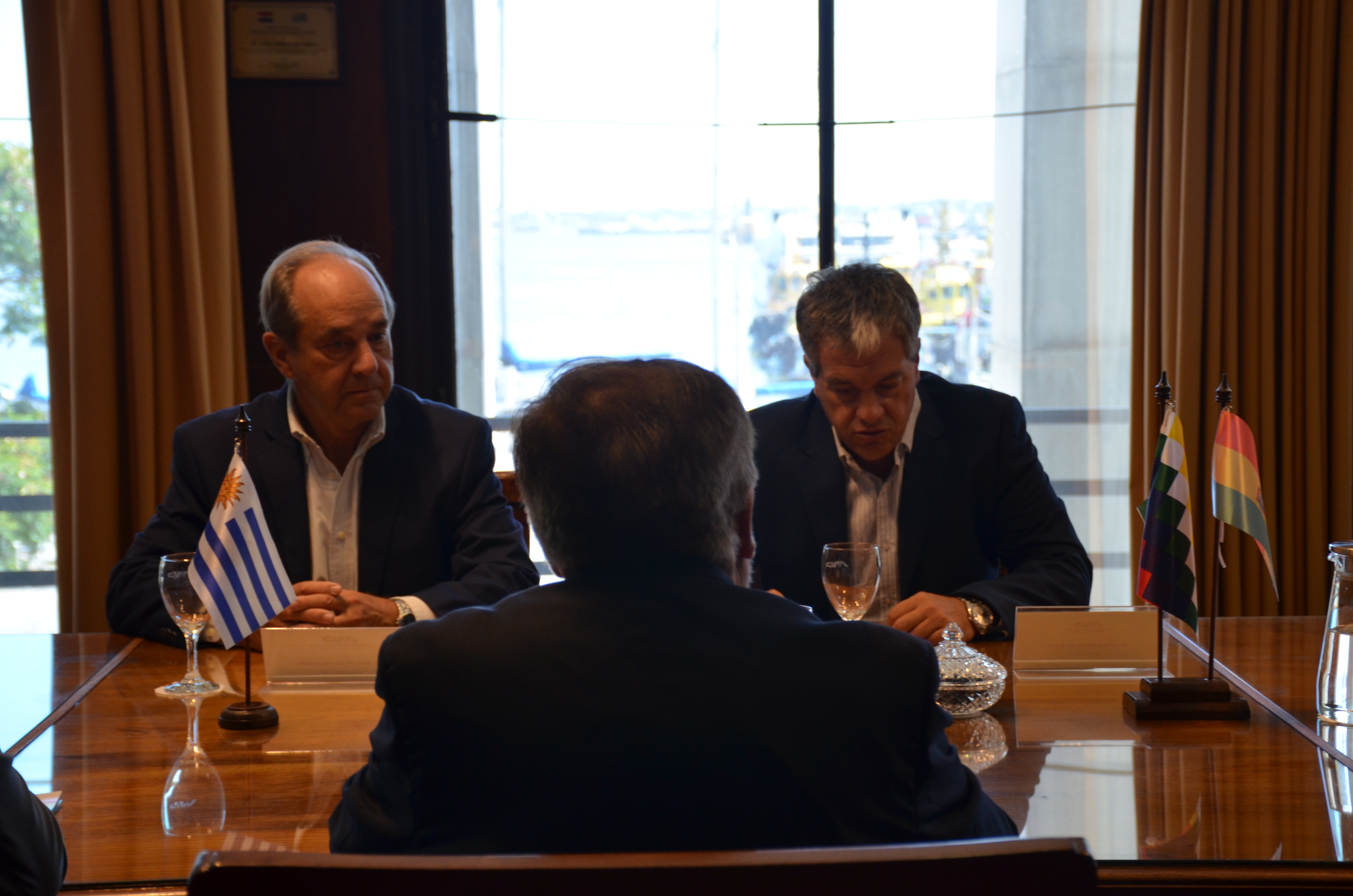 La delegación boliviane en visita a los puertos comerciales uruguayos estuvo integrada por el embajador, Adalid Contreras Baspineiro, la consejera, Lourdes Aldana Rojas, y el segundo secretario, Gaspar Alejandro Uriarte. En el edificio sede de la ANP fueron recibidos por el presidente, Juan Curbelo, y el vicepresidente, Daniel Loureiro.