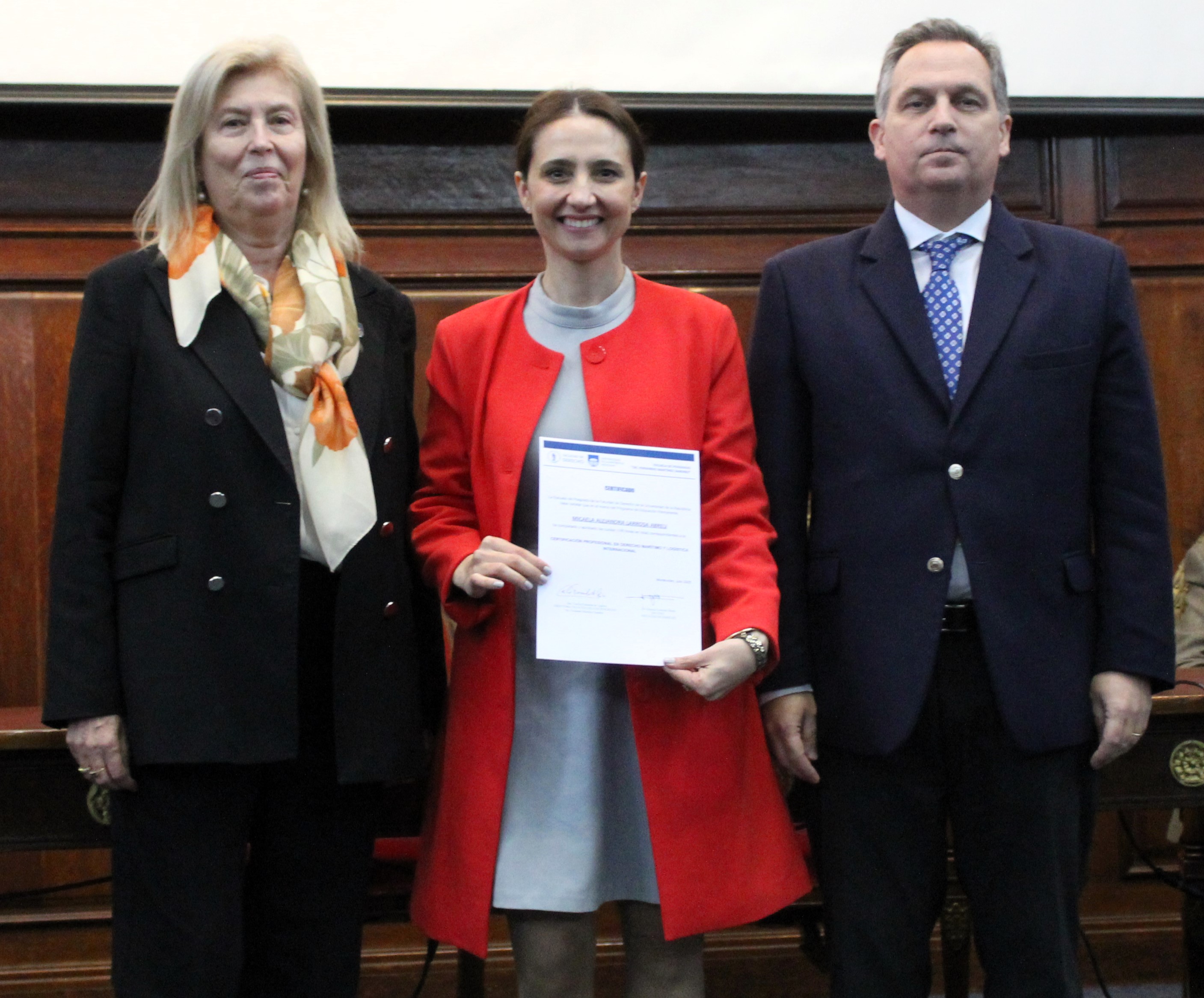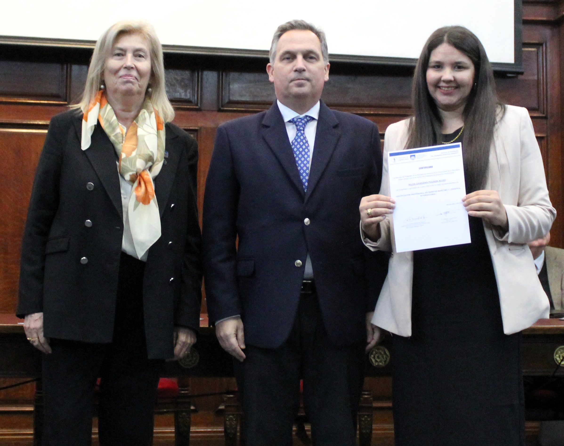 La entrega de diplomas estuvo a cargo de la directora de la Escuela de Posgrado, Cecilia Fresnedo, y del decano de la Facultad, Gonzalo Lorenzo, acompañados por el director de la Certificación, Alejandro Miller, la responsable del Área de Derecho Marítimo, María Victoria Zorrilla, el responsable del Área de Logística y presidente del INALOG, Jerónimo Reyes, y el vicepresidente de la ANP, Tany Mendiondo.