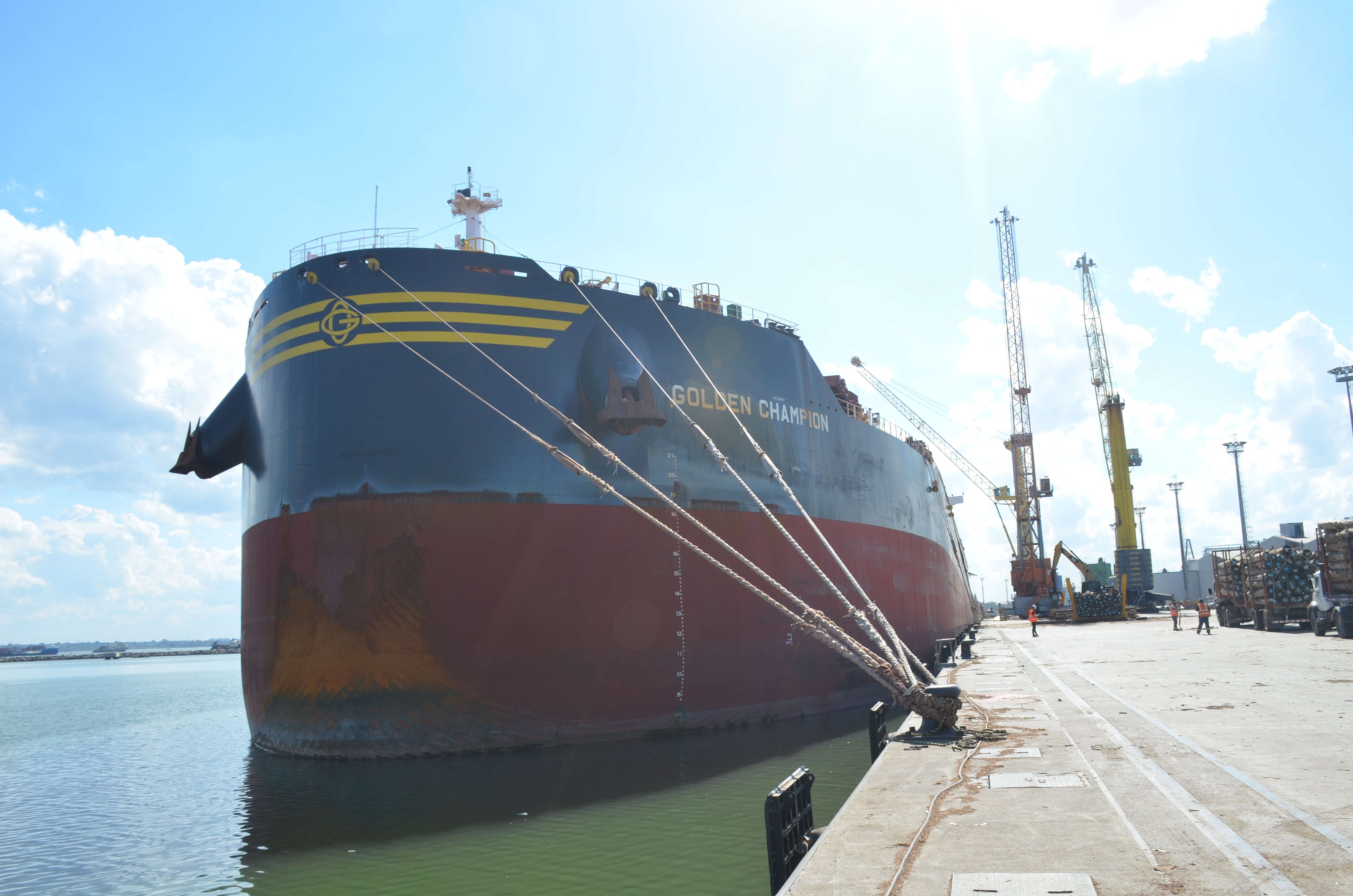 Se trata del buque granelero Golden Champion, con una capacidad de carga de 208000 t, eslora de 300 m, manga de 50 m y un caldo de 9,8m, botado en el año 2019 es un nuevo gigante que opera en nuestro puerto.